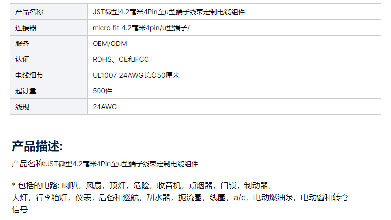 JST微型4.2毫米4Pin至u型端子线束定制电缆组件