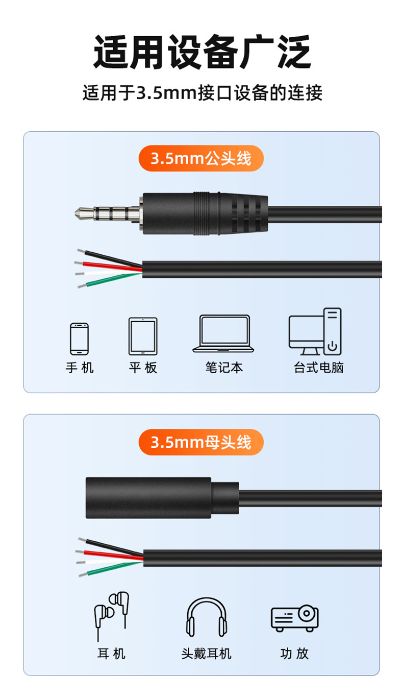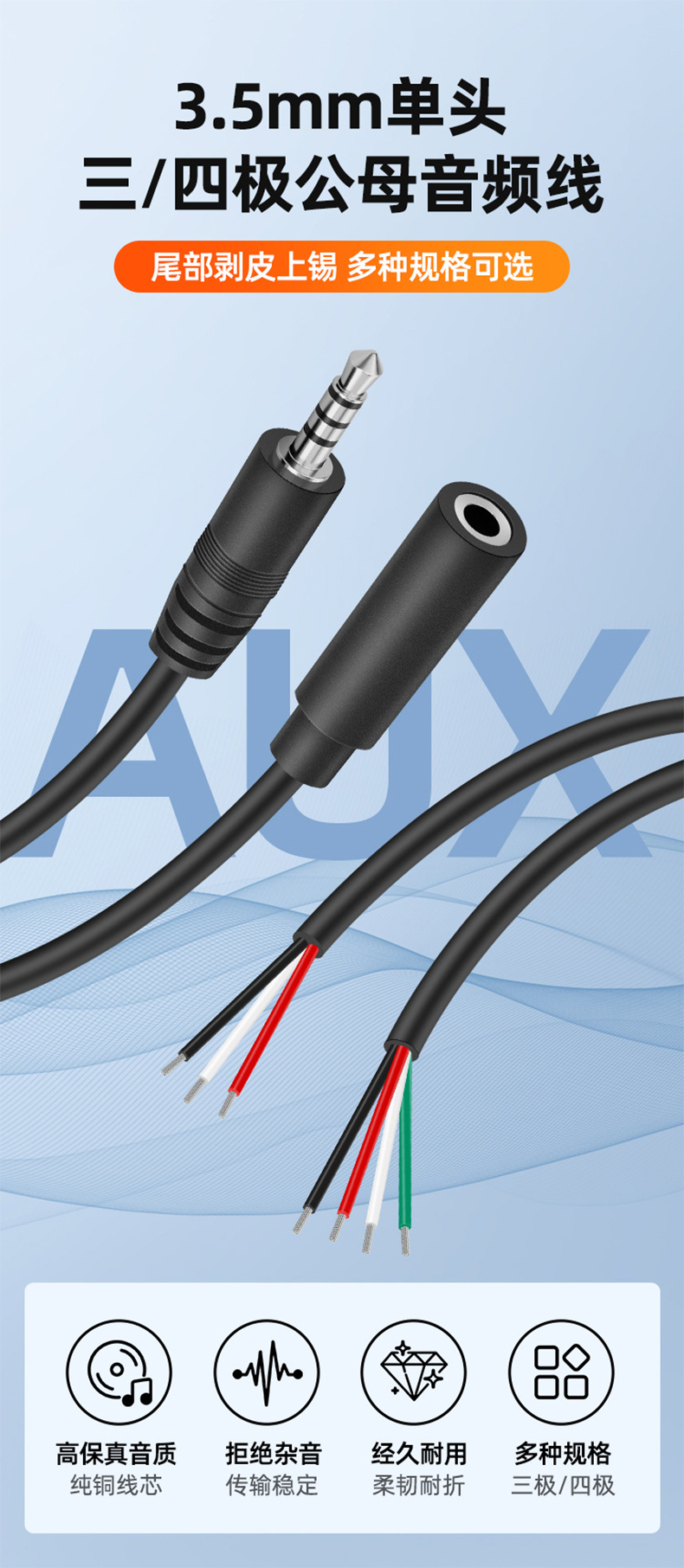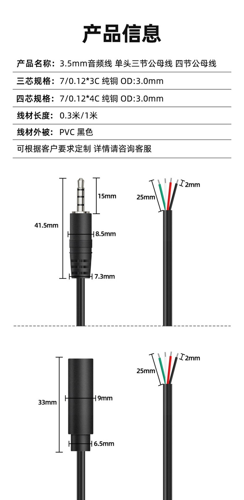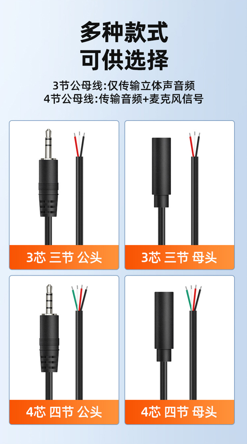3.5mm音频线3节公母头4芯aux单头对上锡连接线3.5耳机线